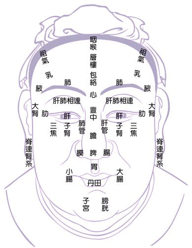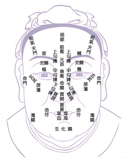 十七.两颧骨原名国印。又名东西岳。内属三焦之连带系。古人则谓三焦有名无质。不过分上中下之义耳。果如此说。何不谓上段中段下段。又何得以三焦。名之耶。余考新法。及解剖学。谓脏腑中有连网油一物。上补正气之不足。下逐浊秽之有余。其关系之重要。与古人之论三焦相等。大体三焦。即连网油之别名。唐宗海证实为三焦也。而在大小肠之上。曲折以掩护各脏也。其地位以高耸上插为权重。而贵名之事业非常。即国家之屏藩也。以抵小陷弱。主平常而不贵。其才智能为皆不足也。如隆大而地位不近目尾。此为假权。多应优伶界中人也。如泪堂下插而破颧骨主患神经病而减智识。此地如有黄紫明润之气色。主进权禄而升迁。获功进职也。如有青浮滑腻之气色。主謪贬去权。忧愁惊恐。常人亦主障碍损失。冷退破财。如有黑赤红滞之气色。主危险死亡。牢狱枷锁。轻亦主孝服刑伤。大破败之惊恐也。如红绦浮光。则为酒湿痣漏之病。如红艳浮光。则为情欲劳伤之疾。原名国印。今更名曰屏藩。即为国家屏藩重镇而名之也。